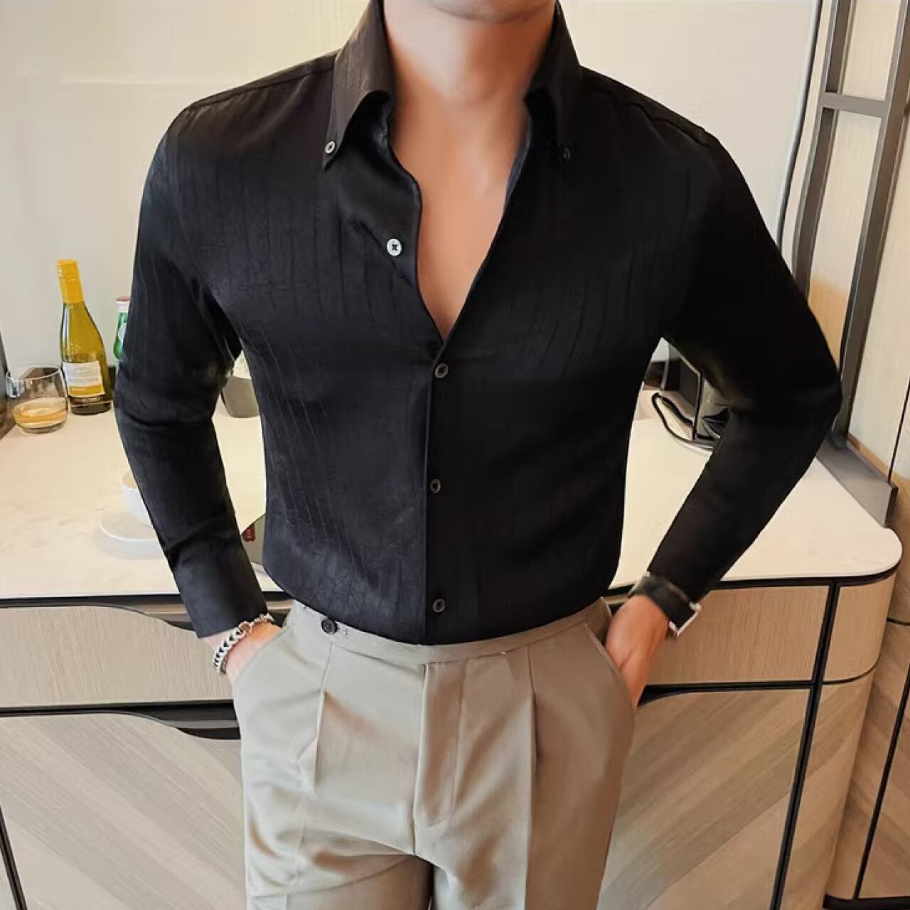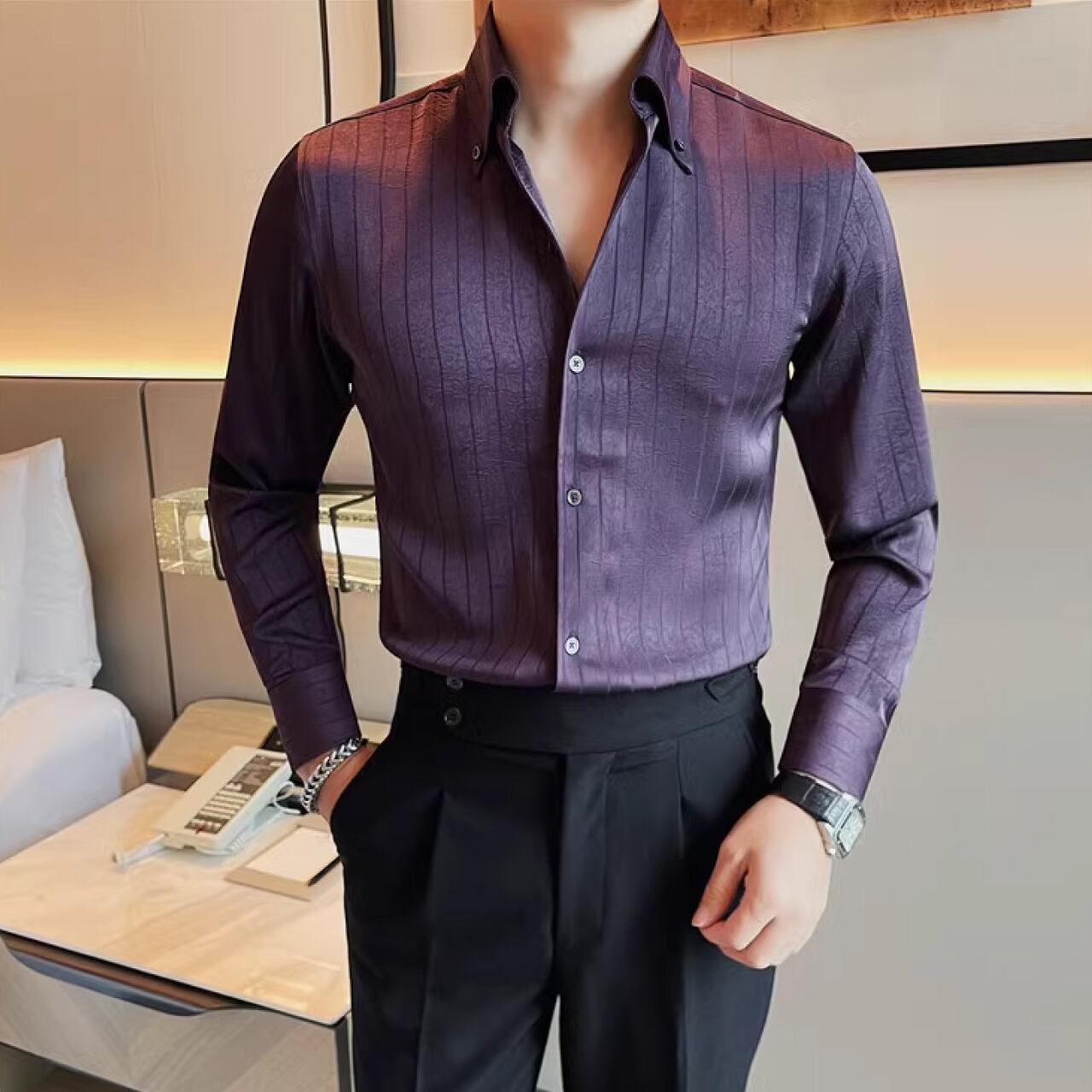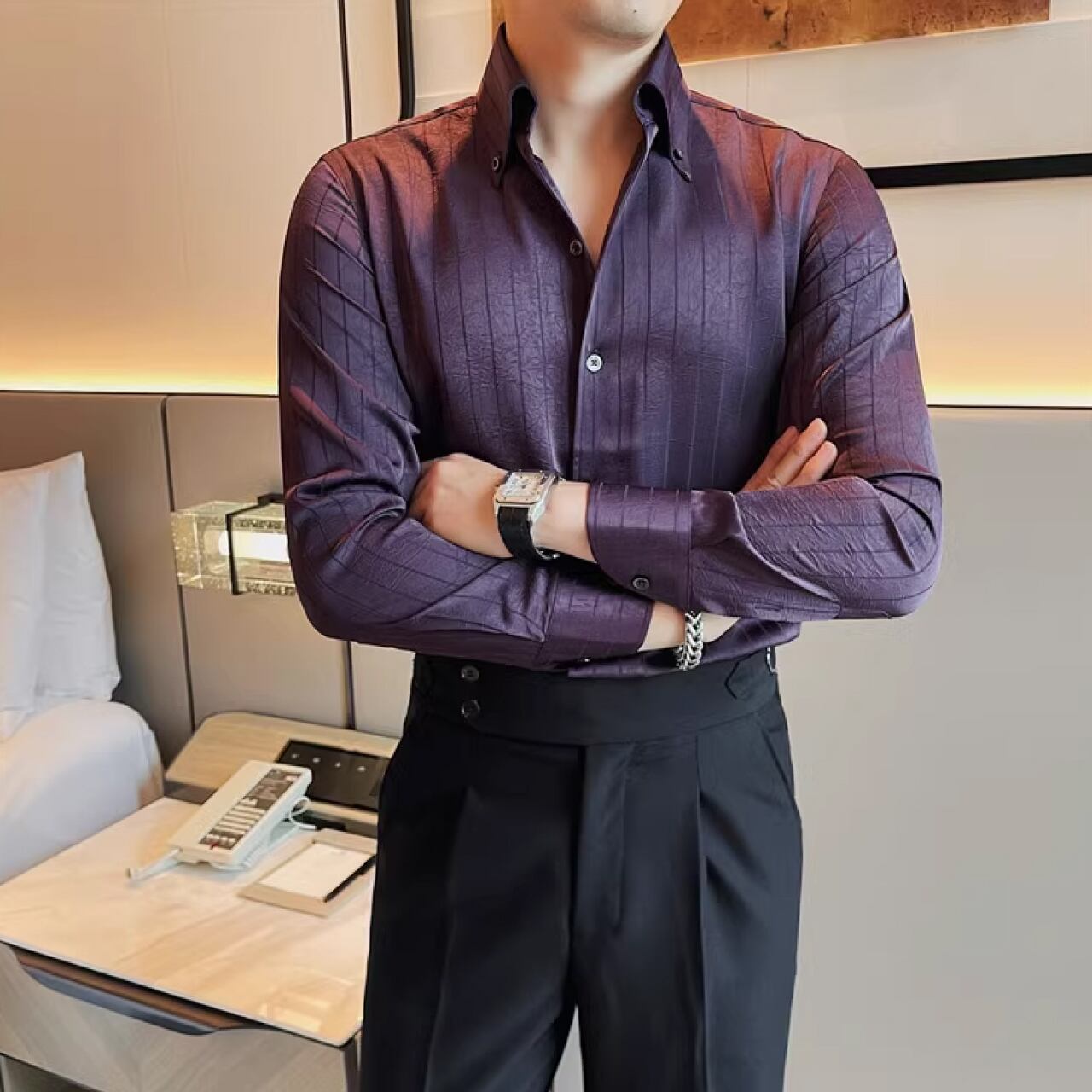 ダークストライプシャツは、ハイエンドなビジネスカジュアルスタイルにピッタリの一枚。